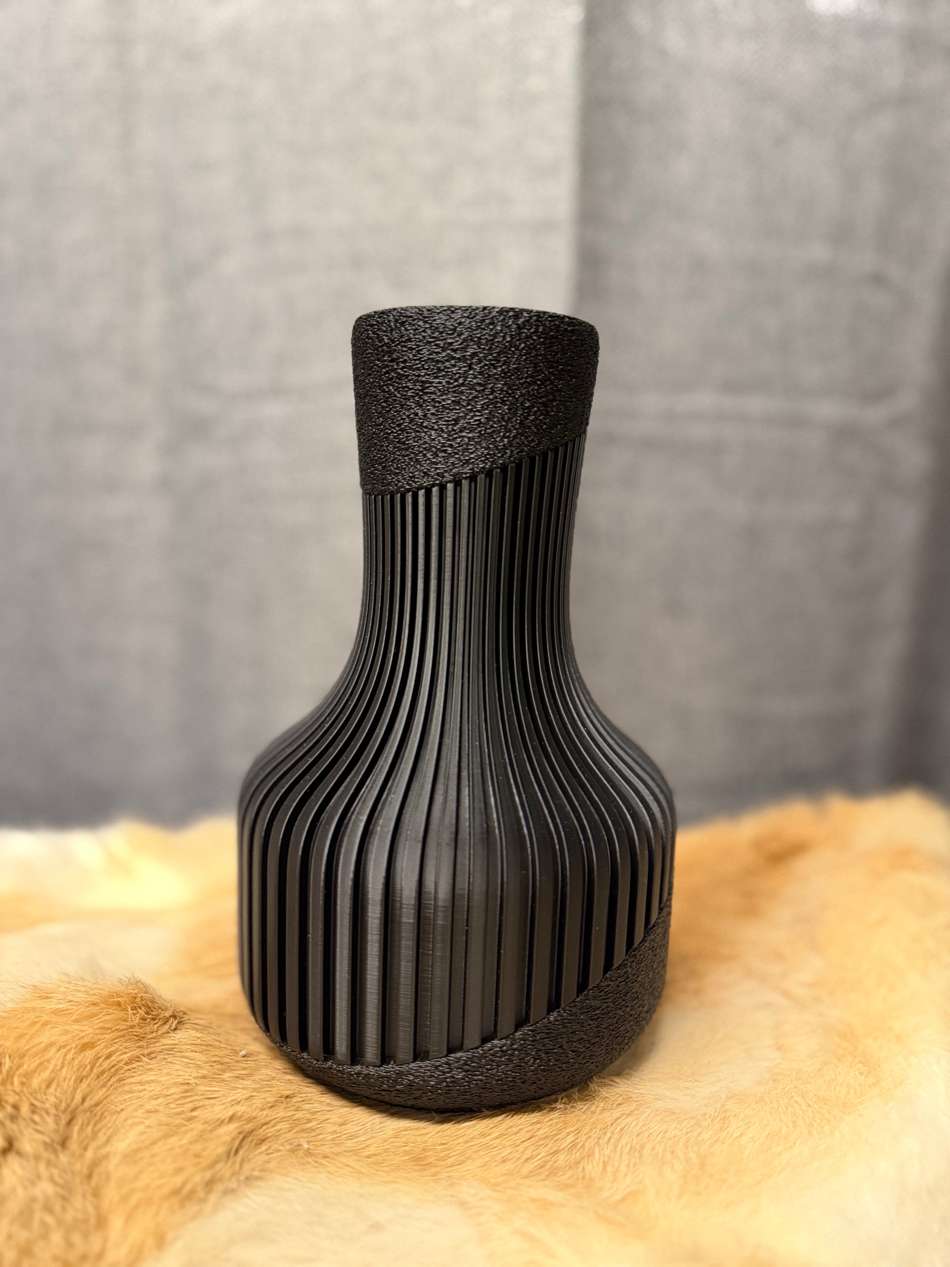 Deze stijlvolle, 3D-geprinte designvaas is een echte eyecatcher in je interieur. Dankzij de matte zwarte kleur, ribstructuur en speelse afwerking onder- en bovenaan heeft de vaas een luxe én moderne uitstraling.