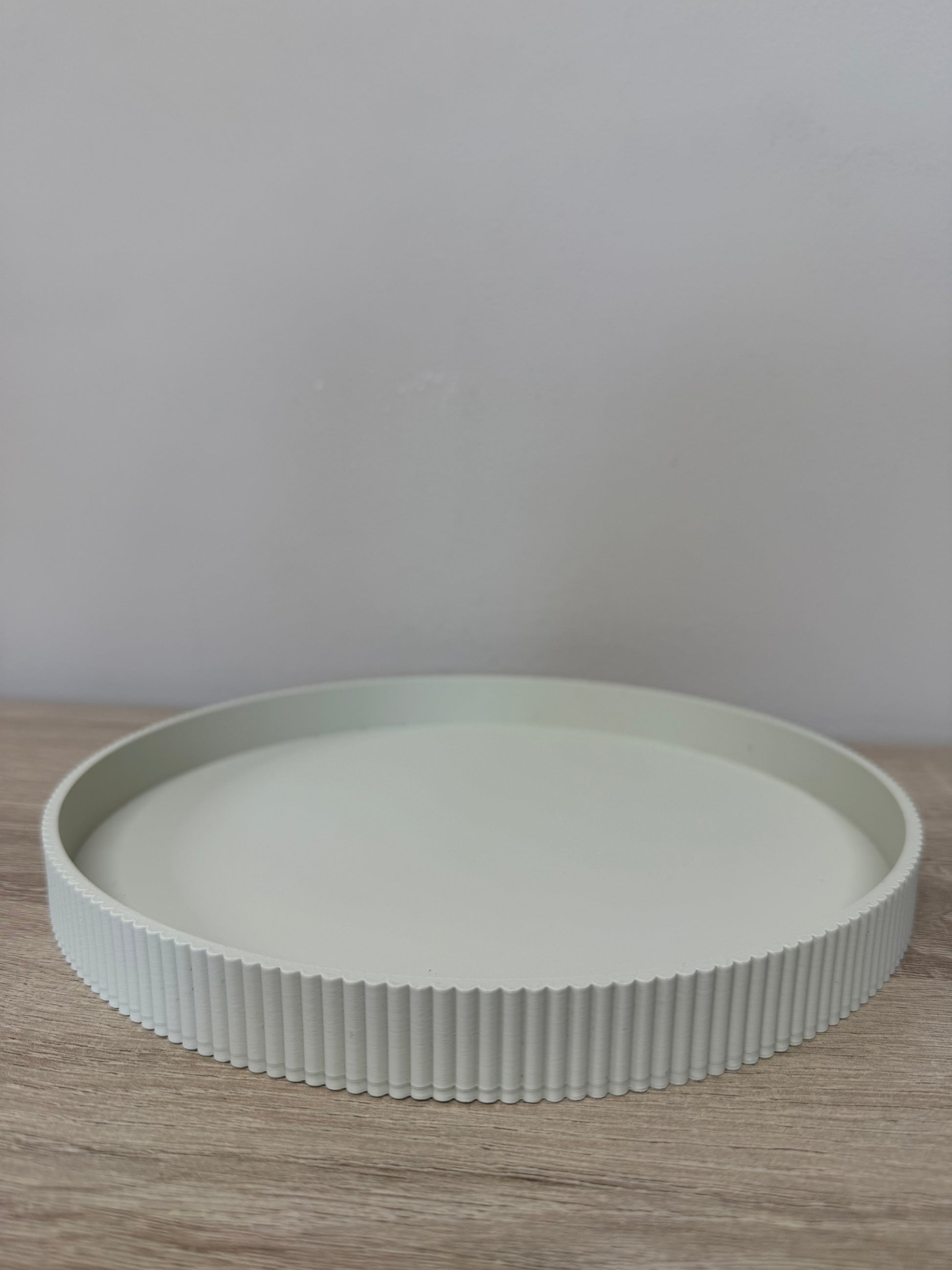 Deze decoratieve schaal in de kleur light khaki is een stijlvolle en veelzijdige toevoeging aan je interieur. De subtiele ribstructuur geeft de schaal een moderne en rustige uitstraling. Perfect als basis voor een decoratieve styling met kaarsen, vazen of andere woonaccessoires.