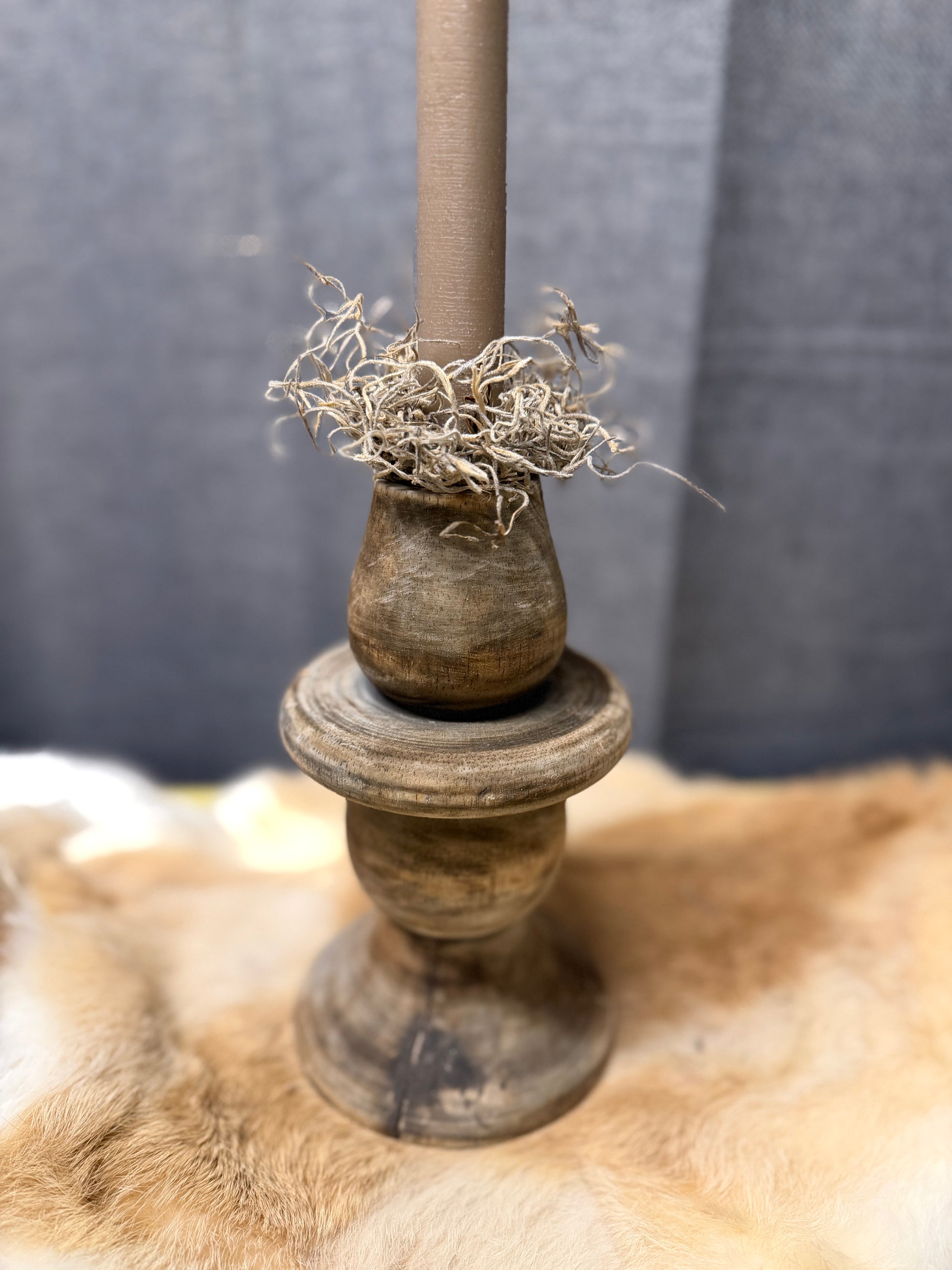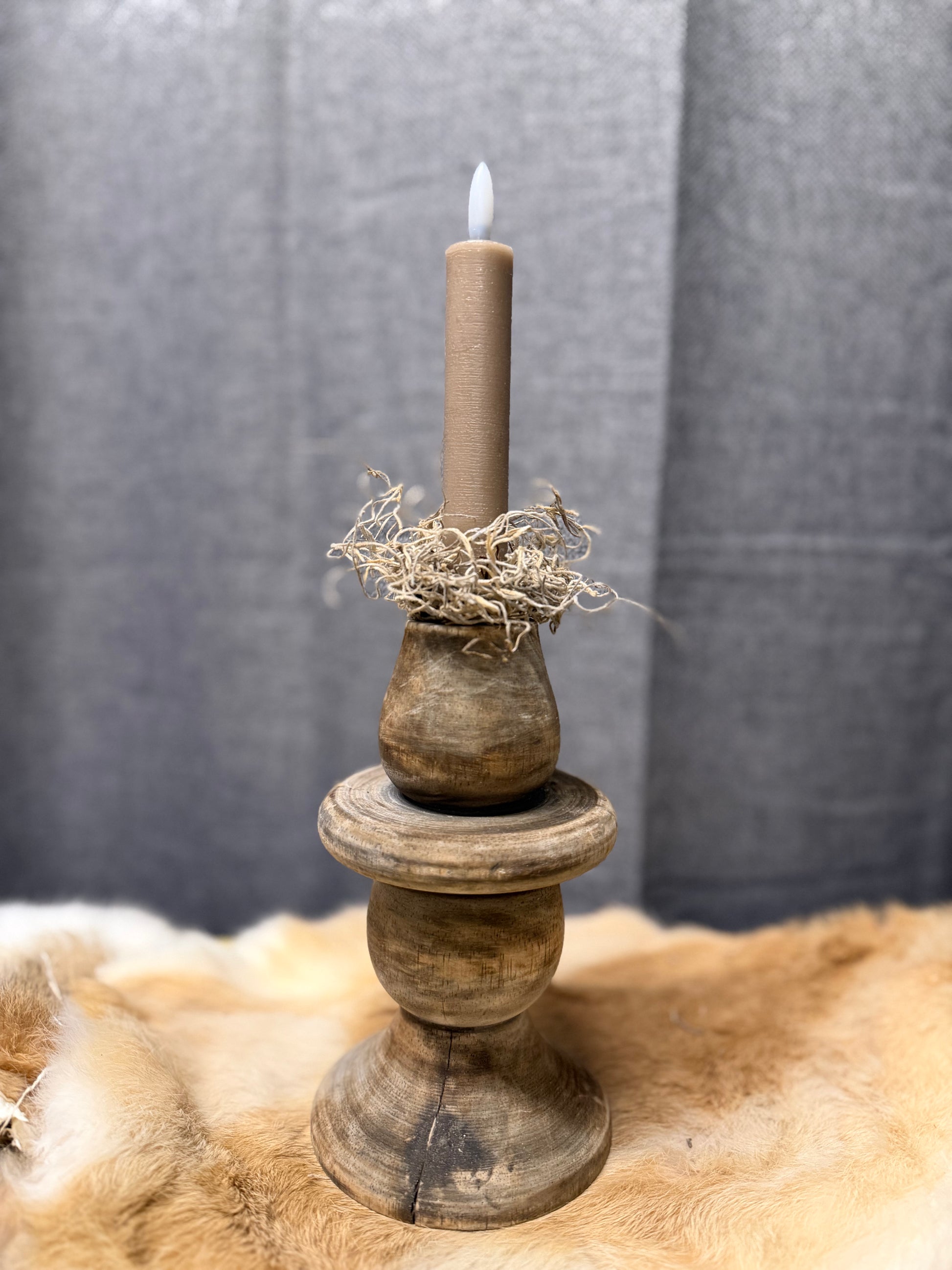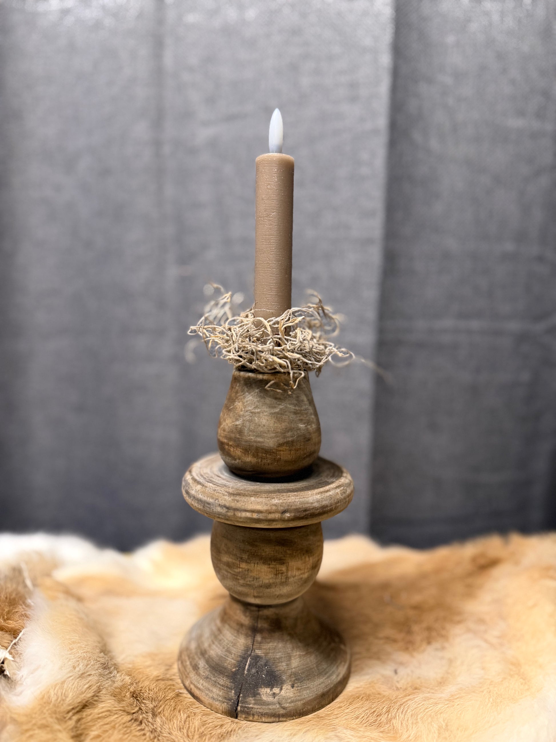 Deze prachtige rustieke houten kandelaar is helemaal klaar om jouw interieur extra gezellig te maken. De natuurlijke houtstructuur en het doorleefde design geven een authentieke, landelijke uitstraling. Perfect te combineren met een LED-dinerkaars (zoals op de foto) voor een warme, veilige sfeer in huis.