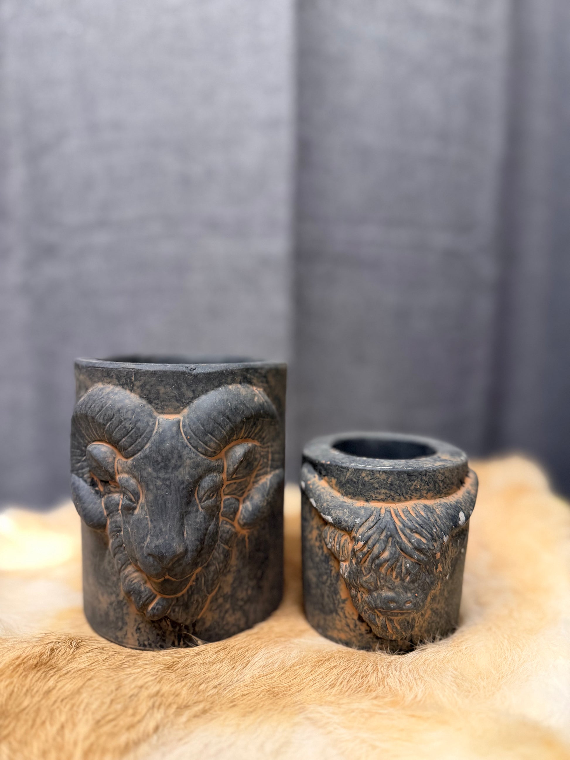 Deze robuuste kaarsenhouders zijn echte blikvangers in je interieur! Ze zijn gemaakt van steen en hebben een prachtig reliëf met dierenkop – één met een ram en één met een stoere highland koe. De verweerde afwerking in donkergrijs met roesttinten geeft ze een doorleefde, landelijke uitstraling.