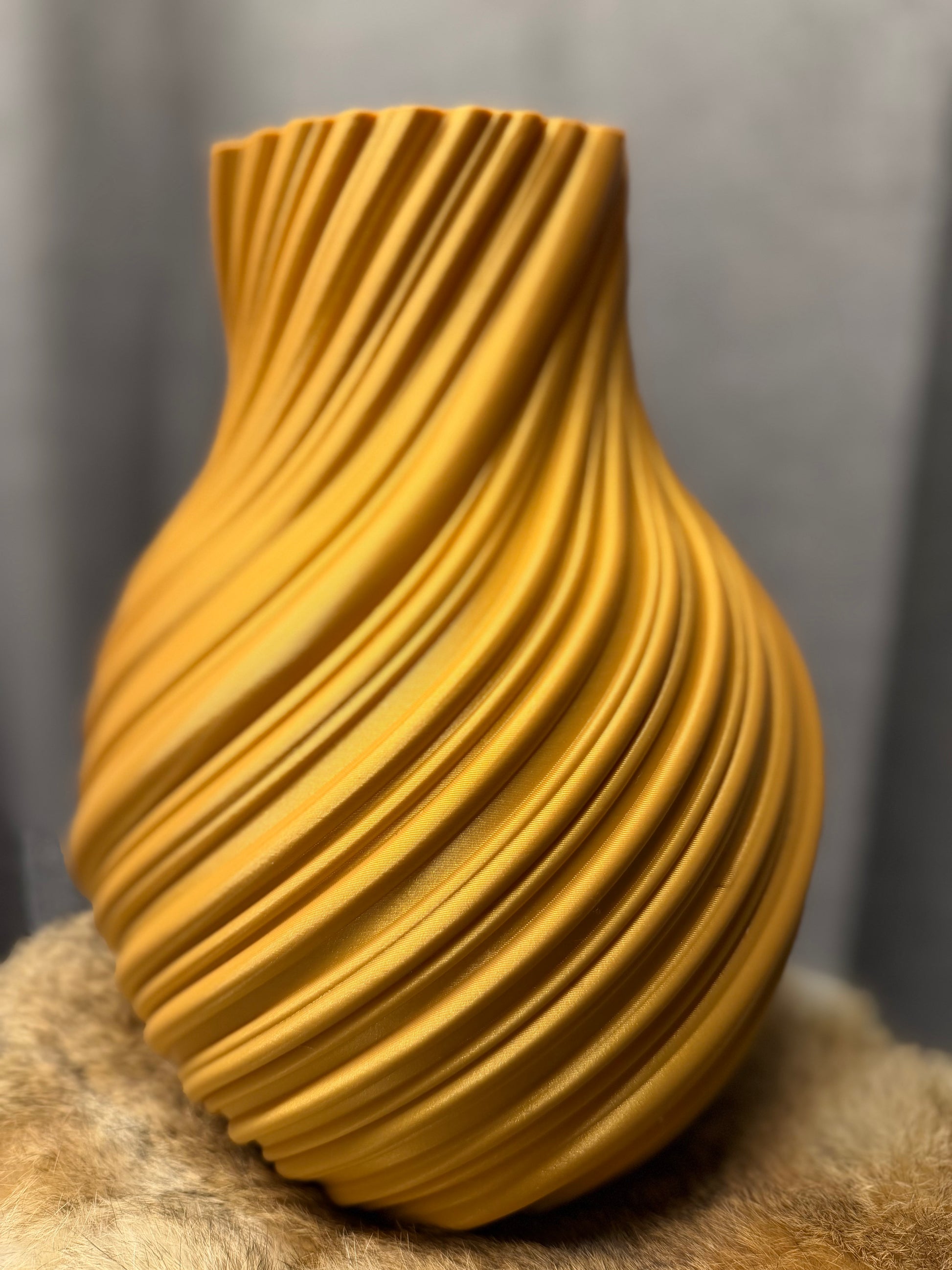 Deze stijlvolle matte gouden vaas heeft een elegante gedraaide structuur die het licht subtiel opvangt en een dynamisch effect creëert. De vorm is klassiek maar modern, waardoor dit ontwerp zowel krachtig als minimalistisch aanvoelt.